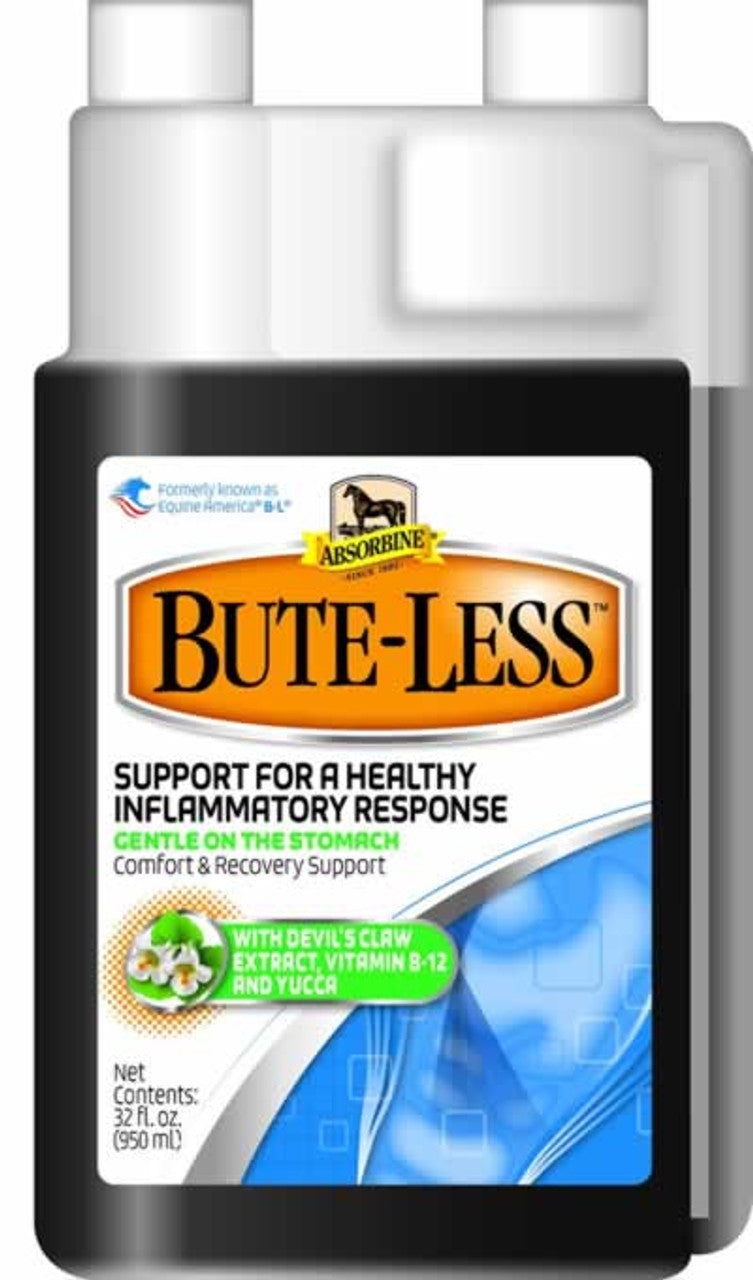 La botella de solución líquida Absorbine Bute-Less contiene una solución para 32 días. Favorece una respuesta inflamatoria saludable. Suave para el estómago. Favorece la comodidad y la recuperación. Con extracto de harpagofito, vitamina B12 y yuca. Hecho en EE. UU.