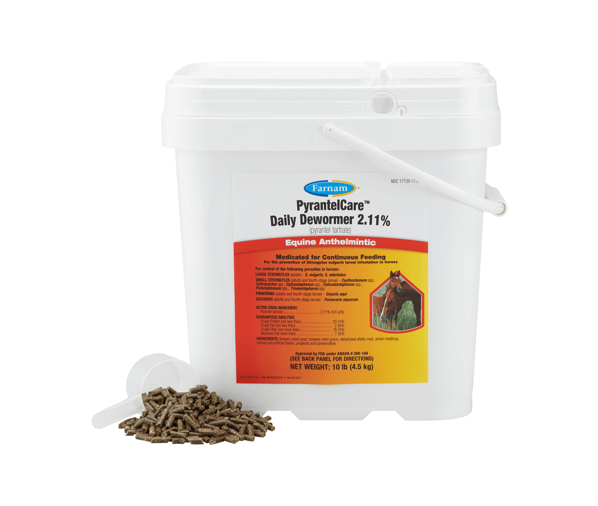 El antihelmíntico equino PyrantelCare Daily Dewormer 2.11% (tartrato de pirantel) proporciona protección continua contra las especies más comunes de parásitos equinos, incluyendo estróngilos grandes y pequeños, ascárides y oxiuros. Medicado para la alimentación continua, previene la infestación por larvas de Stongylus vulgaris en caballos. Añada diariamente los gránulos medicados de fácil digestión sobre el grano de su caballo para una protección continua.